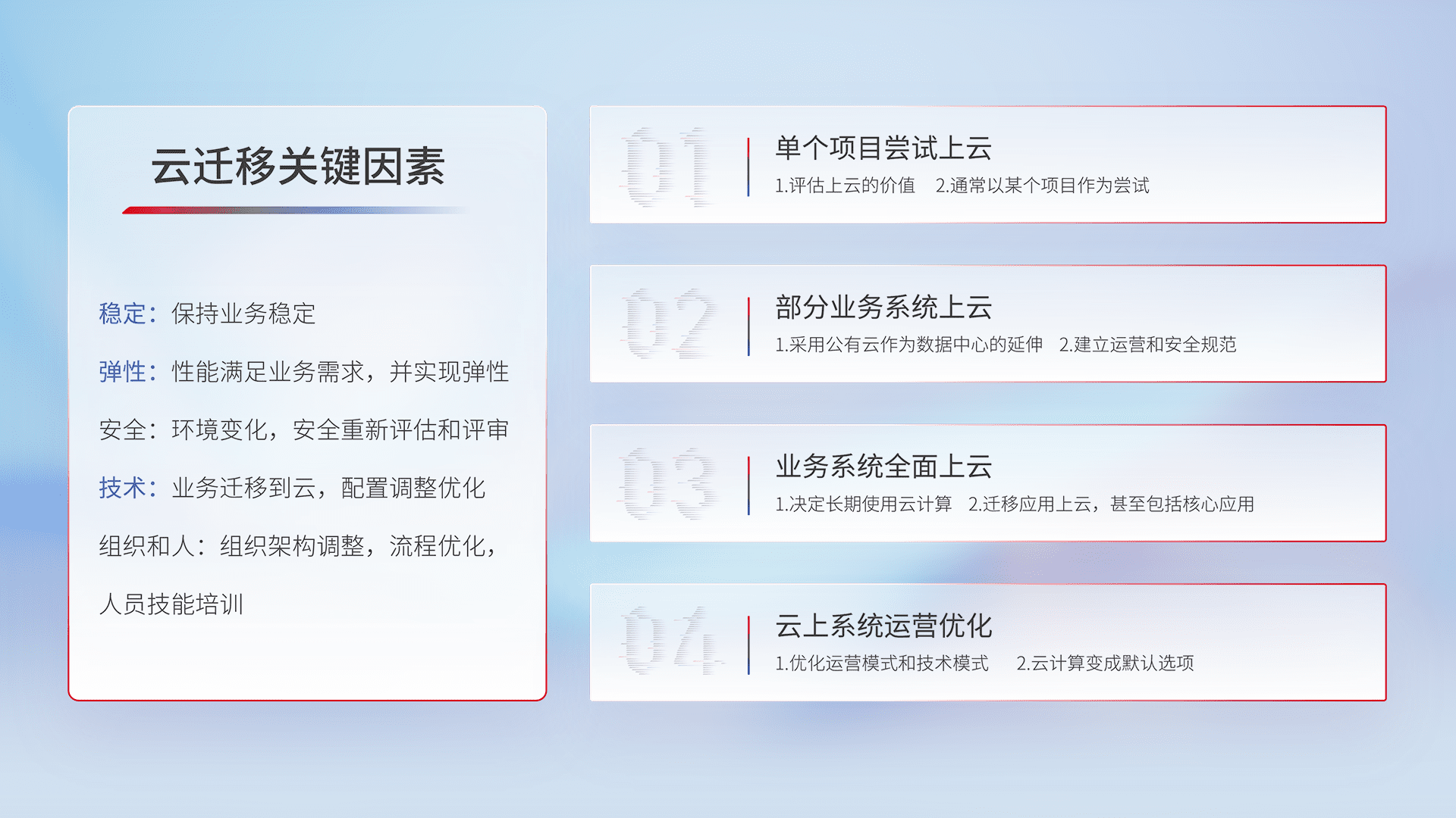 结合实际业务,,,从规划设计、、、、云平台选型、、、、云原生改造、、、数据迁移、、集成交付,,,迁移全过程为客户识别最佳上云路径,,做好风险识别管理,,设计网络架构、、、、身份权限、、安全审计合规、、、操作审计、、日志审计、、、监控告警策略、、多站点容灾设计等,,对云上基础设施进行整体规划,,提升IT治理水平,,,以满足弹性、、、、高可用、、、高性能的需求。。