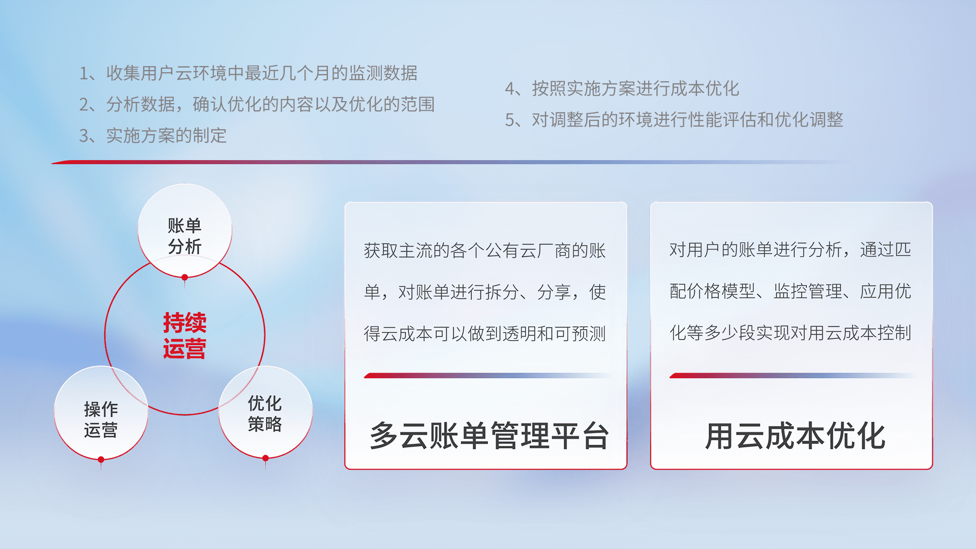 通过多云纳管,,,,以统一的资源数据模型把客户的云资源进行抽象和封装,,,,进而实现对多云资源的统一操作,,,保障云资源管理的可靠性、、、稳定性与可用性。。。。量身定制化运维内容,,,,配置、、、开发运维、、补丁管理、、、备份、、、、监控、、、认证和访问管理、、、审计和日常巡检等,,,保障在用云过程中的可靠度,,,稳定度以及高可用率。。。。