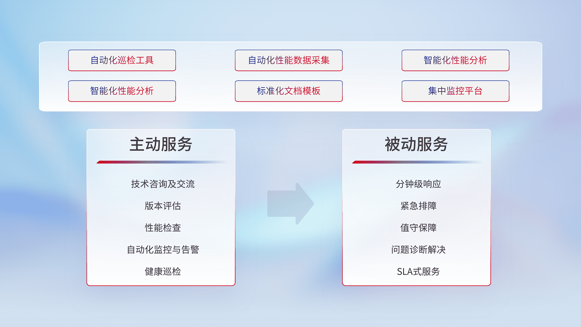 智能化工具和标准化文档,,,保障服务质量,,提供主动服务(包含技术咨询、、、版本评估、、、性能检查、、、、自动化监控与告警、、健康巡检)和被动服务包含(分钟级响应、、、紧急排障、、、、值守保障、、、、问题诊断解决、、、SLA服务)。。。。