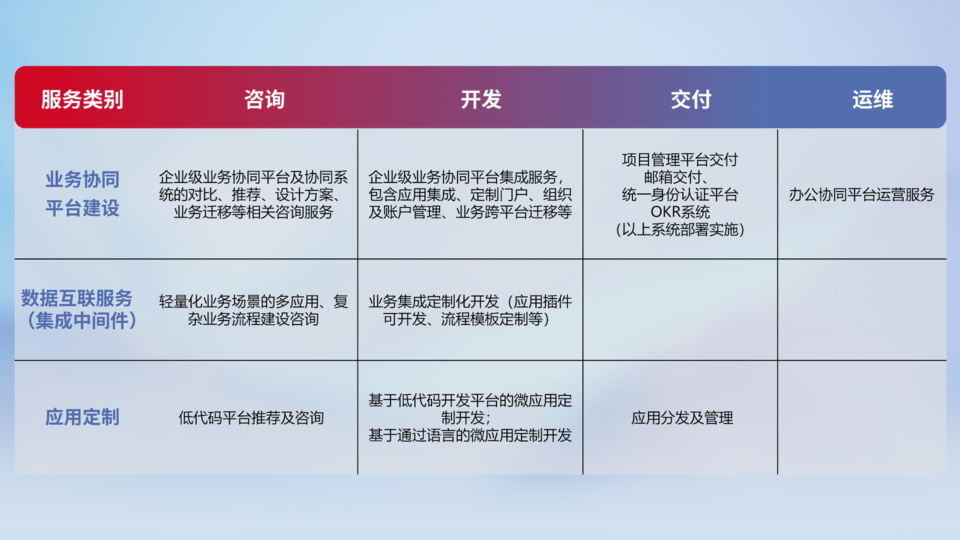 针对钉钉、、、、企微、、IDaas等平台级产品提供产品的规划、、、方案、、、交付、、定制化开发等服务,,实现如统一协同办公、、、智能客户服务、、混合会议管理、、、智能数据查询、、、、等业务场景,,,,实现数字化转型。。。